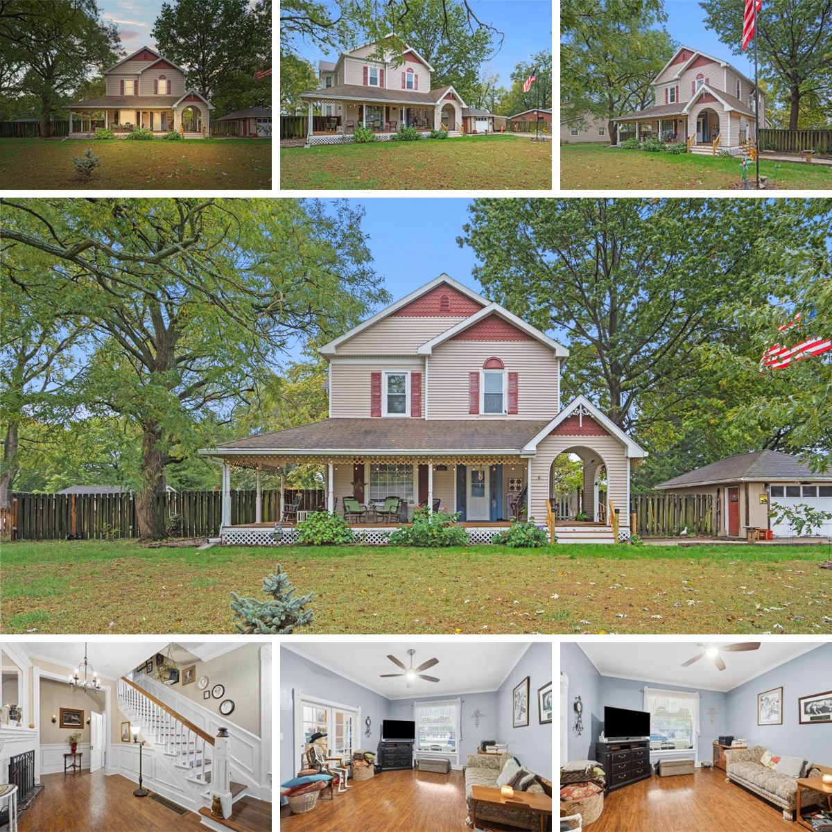 Welcome to this elegant Victorian style 2 story home, offering timeless charm and inviting spaces throughout. A grand, welcoming front entry sets the tone as you step inside, leading to a warm and spacious interior that blends classic character with modern updates. Featuring four generous sized bedrooms, one full bath, upstairs and one half bath, on the main, this homes offers comfort and functionality for todays lifestyle. Enjoy new pergo floors throughout the main level and cozy up to two fireplaces, adding warmth and ambiance to the entry and family rooms. The chefs kitchen is a standout and, complete with stainless steel appliances, gas stove, prep island and ample counter and cabinet space-perfect for cooking and entertaining. A separate laundry room provides added convenience. Outside, relax or entertain, on the enclosed back patio, or enjoy the wrap around front porch overlooking the spacious .40 acre lot. A detached one-car garage adds additional storage and practicality. This home captures the best of classic architecture and modern living- a truly special property ready to welcome its new owner.